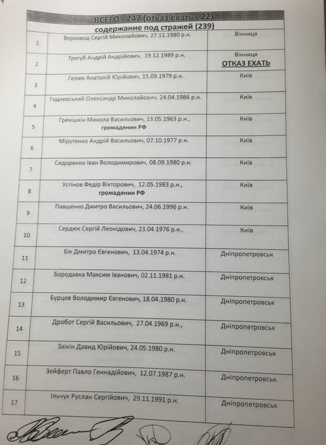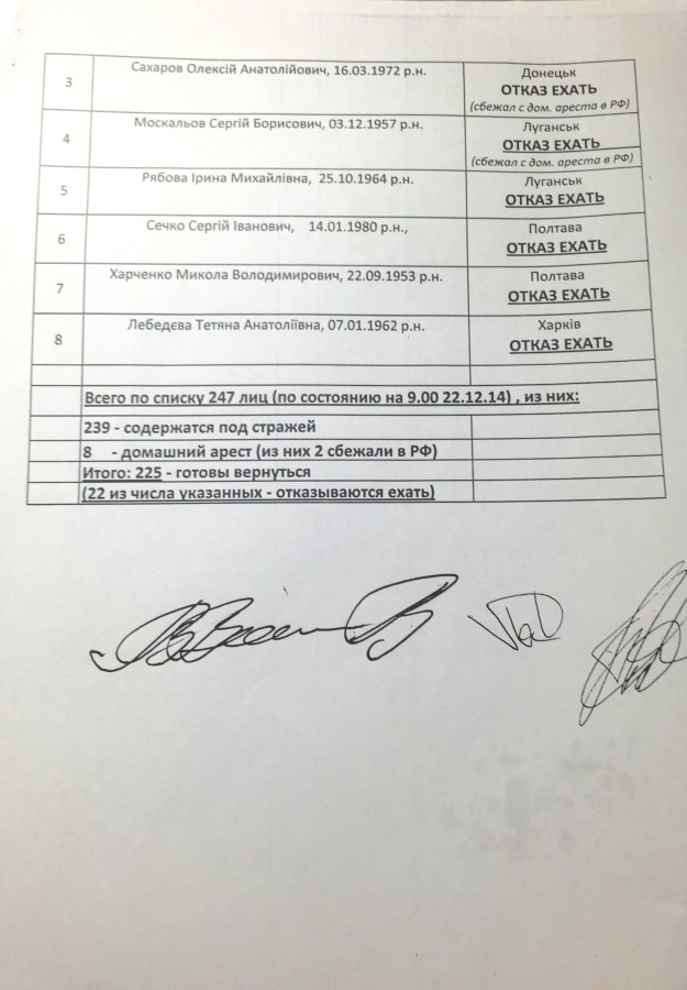 Окончательный список обмена мы потом уже согласовали в Минске. На них поставили подписи я и «представители ДНР и ЛНР» Владислав Дейнега и Денис Пушилин. Они подписывать отказывались, я крыл их матом, Кучма и Тальявини не вмешивались. В итоге они согласились и 26 декабря обмен произошел