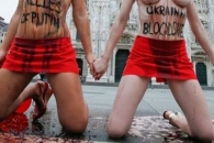Активистки украинского движения сегодня в Милане устроили свою традиционную акцию оголения. В этот раз девушки разделись в центре итальянской столицы, но обливались не кровью, а красным вином.