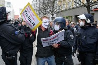 Возле Бранденбургских ворот около 8000 человек скандировали лозунги "Мир, свобода, нет - диктатуре!", "Сопротивление", "Мы - народ!", а также отказывались соблюдать социальную дистанцию и носить защитные маски.