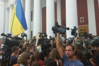 Протестующие переместились от городского совета к зданию прокуратуры, пообщаться с людьми вышел прокурор области Олег Жученко.