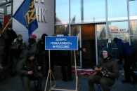 Активисты собрались у входов в Сбербанк России, Альфа-Банк и VTB, заклеили окна листовками и требуют, чтобы НБУ убрал из Украины финучреждения страны-агрессора