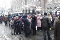 Несколько сотен митингующих, по большей части женщин пенсионного возраста, собрались под зданием Национального банка на улице Институтской на второй день акций протестов в Киеве.