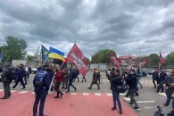 У входа на завод Антонов, в цеху которого в данный момент президент отвечает на вопросы СМИ, собрались активисты партии Демократична сокира.