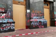 Клининговая компания пытается отмыть фасад Офиса Президента Украины от рисунков и надписей, которые нанесли активисты во время митинга 20 марта, но есть определенные трудности.