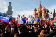 Несколько десятков тысяч россиян собрались у стен Кремля, чтобы отметить годовщину аннексии Крыма. На Васильевском спуске установлена сцена, на которой написано "Мы вместе". Участниками акции заполнены все прилегающие набережные, а также Большой Москворецкий мост, на котором 19 дней назад был убит российский политик Борис Немцов.