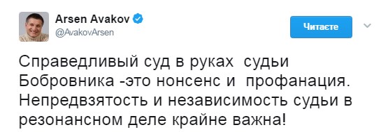 Справедливый суд в руках судьи Бобровника - это нонсенс и профанация. Непредвзятость и независимость судьи в резонансном деле крайне важна! - написал украинский министр.