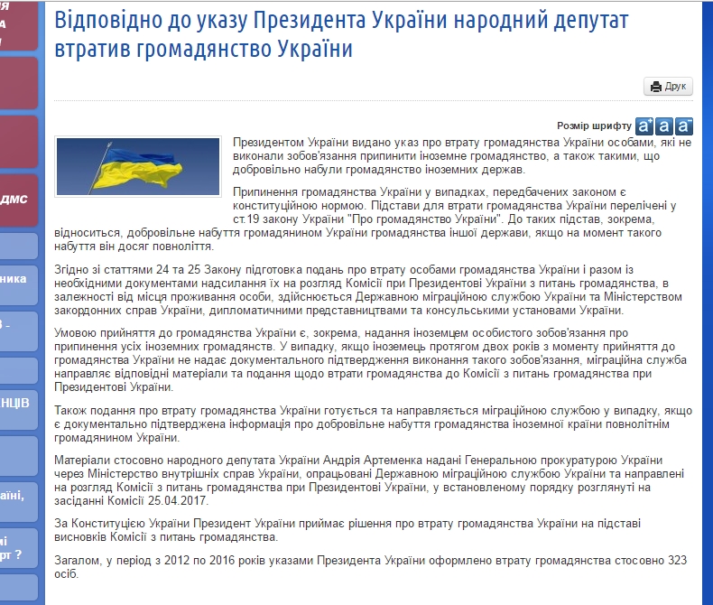 Материалы относительно прекращения украинского гражданства Артеменко были предоставлены Генпрокуратурой, комиссия по вопросам гражданства при президенте Украины рассмотрела их 25 апреля.