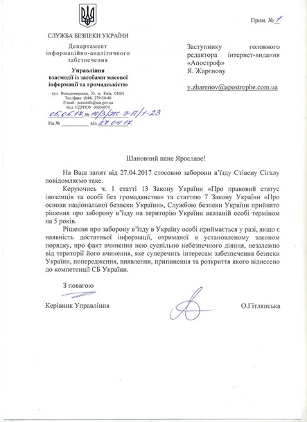 "Службой безопасности Украины принято решение о запрете выезда в Украину указанному лицу сроком на 5 лет", - сообщили в СБУ.