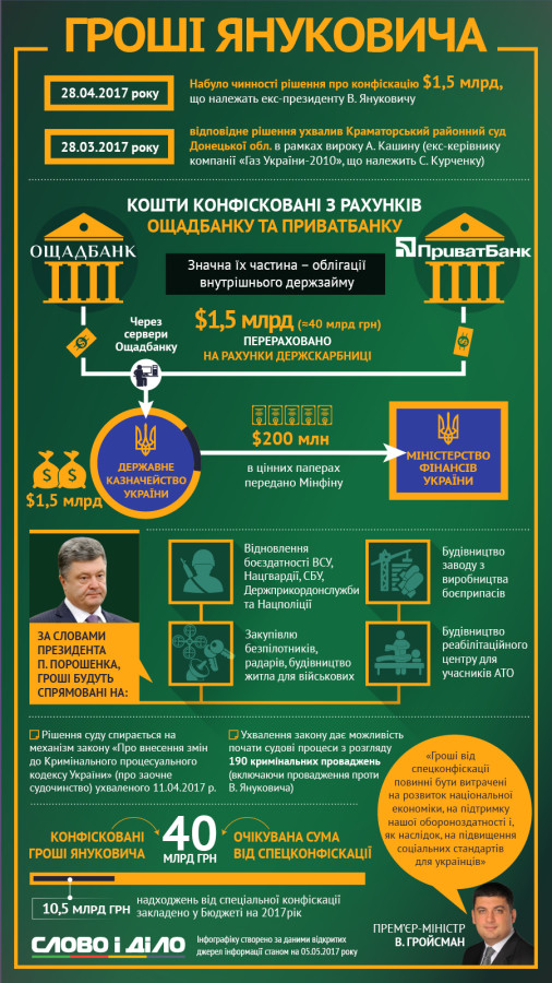 28 апреля вступило в силу решение Краматорского районного суда Донецкой области о конфискации принадлежащих бывшему президенту Виктору Януковичу и его окружению полутора миллиардов долларов, арестованных на счетах Ощадбанка и Приватбанка.
