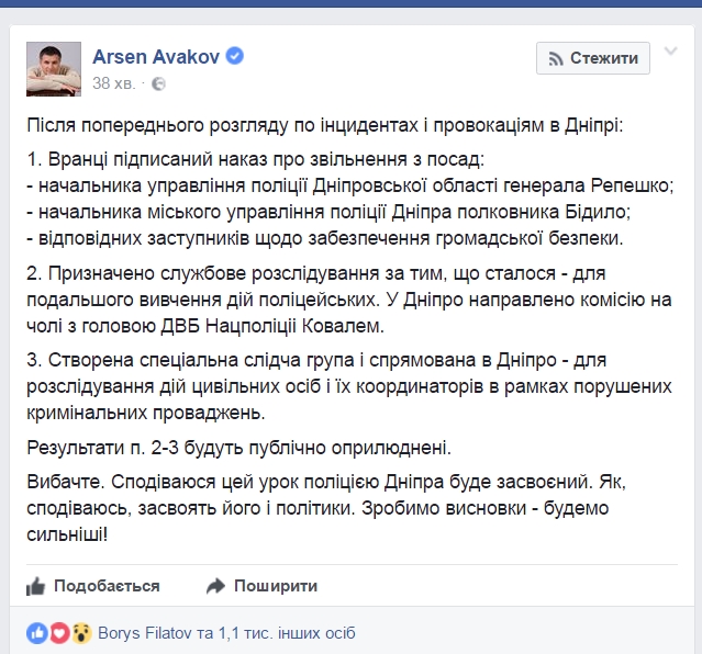 "Утром подписан приказ об освобождении от должностей: начальника управления полиции Днепровской области генерала Репешко, начальника городского управления полиции Днепра полковника Бидыло, соответствующих заместителей по обеспечению общественной безопасности", - написал министр на своей странице в Facebook.