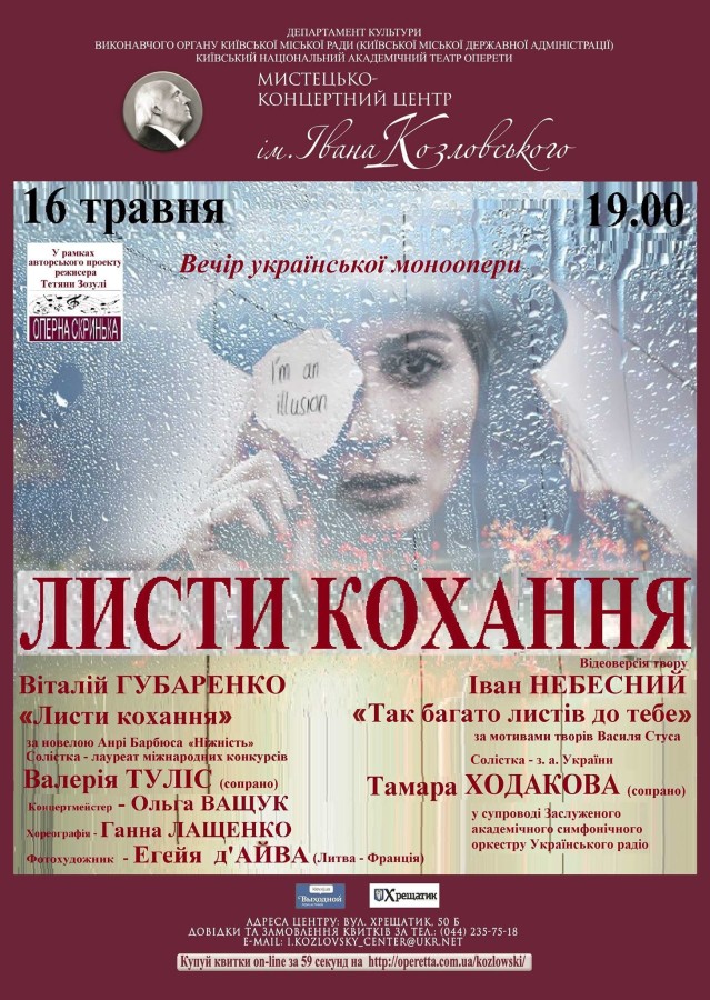 16 мая - в рамках проекта режиссера Татьяны Зозули «Оперная шкатулка» - в Центре им. Ивана Козловского Национальной оперетты состоится вечер украинской монооперы «Письма любви».