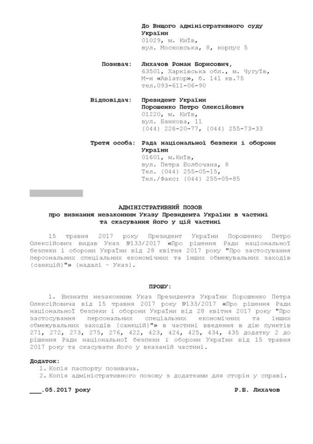 Причиной иска стал указ президента от 15 мая о введении в действие решение Совета национальной безопасности и обороны Украины от 28 апреля 2017 года "О применении персональных специальных экономических и других ограничительных мер (санкций)".