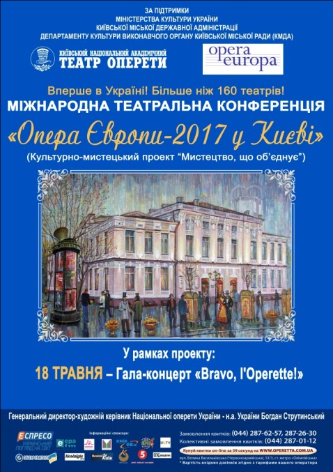 18, 19 и 20 мая 2017 в рамках культурно-художественного проекта «Искусство, объединяет» («Art which unites"), инициированного Киевским национальным академическим театром оперетты пройдет Международная театральная конференция "Опера Европы - 2017 в Киеве" при поддержке Министерства культуры Украины, Киевской городской государственной администрации и Департамента культуры исполнительного органа Киевского городского совета (КГГА).