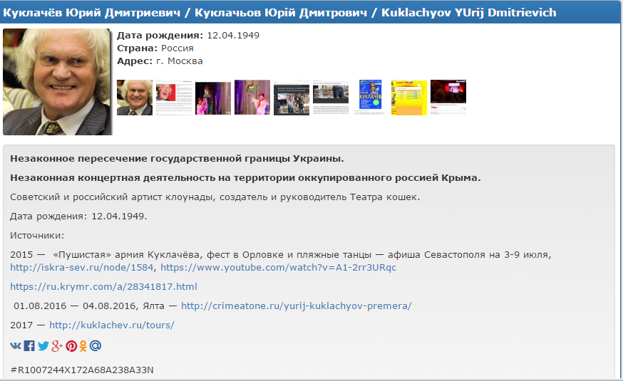 Также указано, когда Юрий Куклачев выступал в разных городах Крыма.