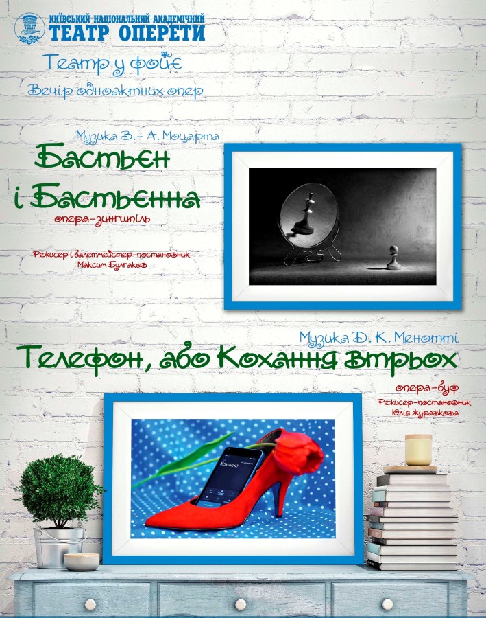 Одноактные оперы «Бастьен и Бастьенна» В-А. Моцарта и «Телефон» Дж. Менотти для Киевского национального академического театра оперетты стали результатом первого и весьма позитивного опыта сотрудничества с молодыми режиссерами. Две постановки, эскизы которых были показаны на малой сцене театра в начале 82 театрального сезона, по итогам Первого Международного конкурса-лаборатории «MusicalArtProject», инициированного генеральным директором-художественным руководителем Национальной оперетты н. а. Украины Богданом Струтинским, в этом же сезоне вошли в репертуар театра.