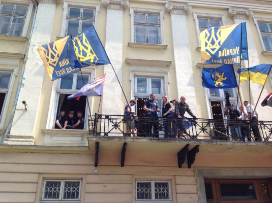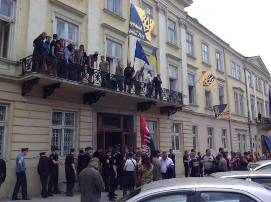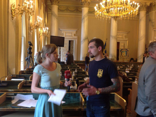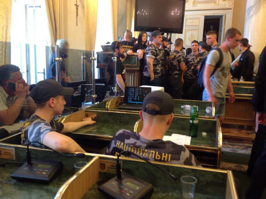 Активисты Национального Корпуса, вошедшие в сессионный зал Львовского областного совета, требуют принять закон об амнистии украинским добровольцам