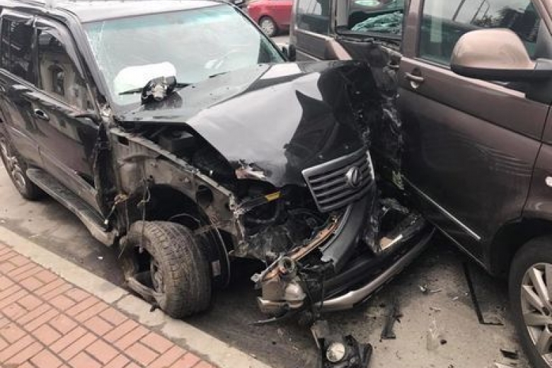 На странице "Автомайдана" в Facebook сообщается, что джип Lexus вылетел на тротуар, снес памятник с довоенным трактором напротив ресторана "Самогон" и врезался через 60 метров в микроавтобус.