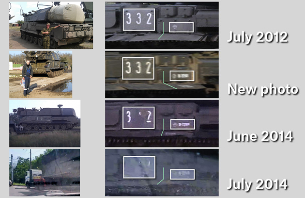 Белые цифры, маркировки центра масс и негабаритного груза на этой фотографии находятся в тех же местах, что и на фотографиях и видео с Буком 332, снятых в России в июне 2014 года и в Украине в июле 2014 года.