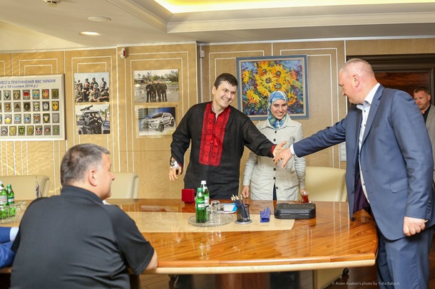 "Ребята, приехали в МВД выпить чашечку чая в товарищеском кругу, и обсудить наше общее антипутинское антитеррористическое дело. Был рад наградить бойца полицейского добробата Амину, взамен старенького ПМ (заклинившего на 4-м выстреле) - новеньким Glock-43. Будем считать, от всех нас, кто переживал и поддерживал Адама и Амину", - пишет Аваков.