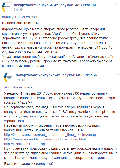 "Уважаемые соотечественники! Информируем, что с целью оперативного реагирования и создания благоприятных условий гражданам Украины для безвизового въезда в государства-члены ЕС в МИД создана рабочая группа, которая будет работать круглосуточно с 00 час.00 мин. 11 июня 2017 года до 00 ч . 00 мин. 12 июня с.г. (по киевскому времени) по телефонам: 044-238-16-37, 044-238-18-54 и 044-238-17-49", – отмечается в сообщении.