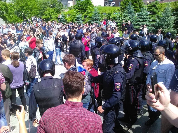 В центре Владивостока на несогласованном митинге оппозиции задержали 11 человек. Между бойцами ОМОН и демонстрантами произошла драка. Среди задержанных - активист Максим Шинкаренко, который стоял со свернутым плакатом, на котором было написано: "Димон, выйди вон".