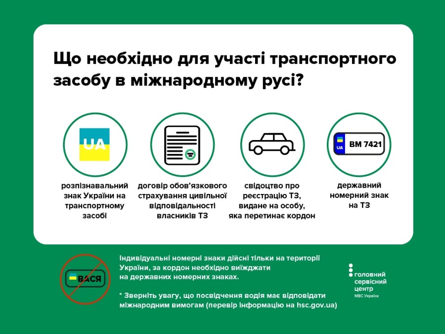 Водителям также нужно помнить, что индивидуальные номерные знаки транспортных средств действительны только на территории Украины, за границу необходимо выезжать на государственных номерных знаках.