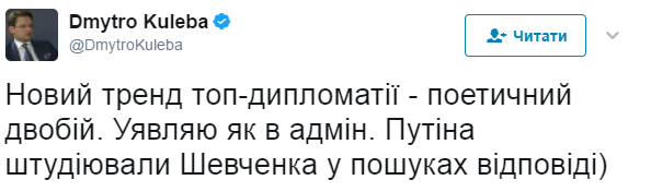 «Новый тренд топ-дипломатии — поэтический поединок. Представляю, как в администрации Путина штудировали Шевченко в поисках ответа», — написал он в своем Twitter.
