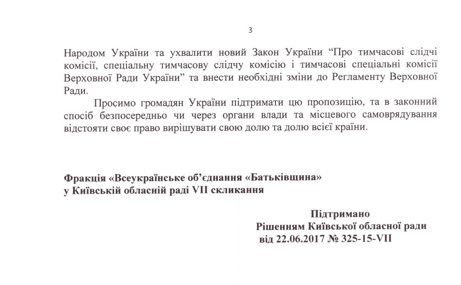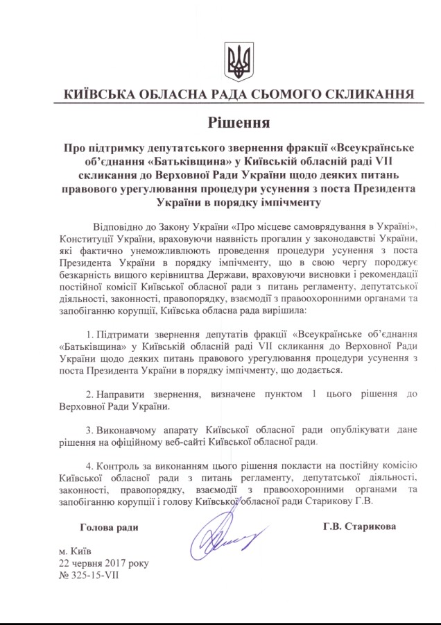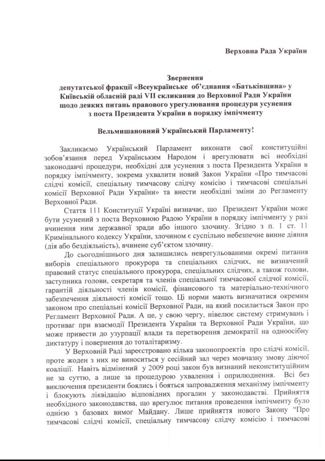Депутаты подчеркнули, что в стране продолжается кровопролитная война, которая только по официальным данным уже забрала жизни более 10 000 человек и украинцы продолжают погибать на этой войне. "Население Украины стареет, болеет, вымирает или уезжает из Украины. Сумасшедший необоснованный рост тарифов на ЖКХ забирает у людей последнюю копейку. Разгул преступности, торговли людьми и оружием стали нашими новыми реалиями. И самое страшное - прикрываясь требованиями Международного валютного фонда, власть хочет отобрать у людей единственное, что осталось - украинскую землю и пустить их по миру нищими". Для устранения действующего президента с поста в порядке импичмента депутаты предлагают неотложно принять новый законопроект о временных следственных комиссиях и изменения в Регламент Рады. Депутаты Киевоблсовета обращаются к гражданам страны за поддержкой импичмента президента Украины.