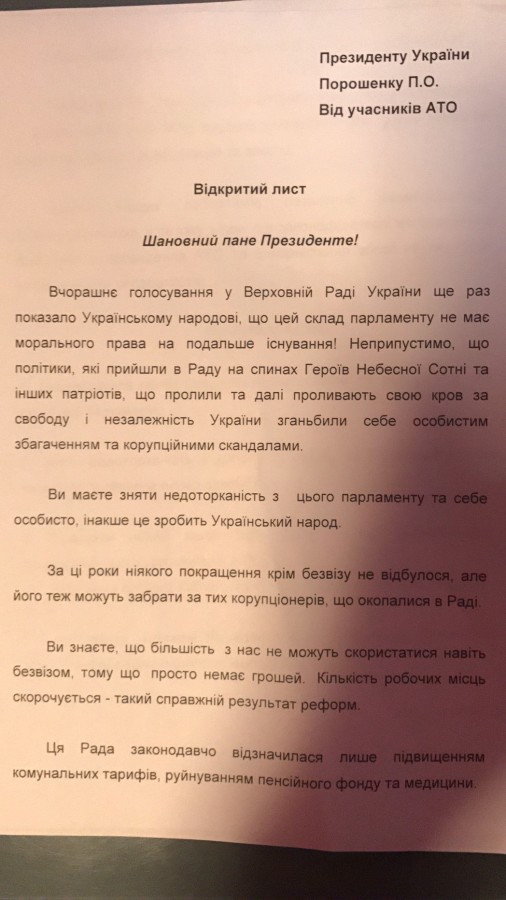 «Уважаемый господин Президент! Вчерашнее голосование в Верховной Раде Украины еще раз показало украинскому народу, что этот состав не имеет морального права на дальнейшее существование! Недопустимо, что политики, которые пришли в Раду на спинах Героев Небесной Сотни и других патриотов, пролили и дальше проливают свою кровь за свободу и независимость Украины опозорили себя личным обогащением и коррупционными скандалами. Вы должны снять неприкосновенность с этого парламента и себя лично, иначе это сделает украинский народ », - говорится в тексте обращения.