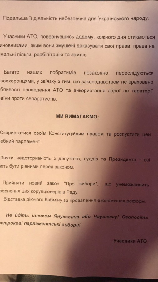 Мы требуем: 1. Воспользоваться своим Конституционным правом и распустить этот позорный парламент. 2. Снять неприкосновенность с депутатов, судей и президента - все должны быть равны перед законом. 3. Принять новый закон «О выборах», что сделает невозможным возвращение этих коррупционеров в Раду. 4. Отставки действующего Кабмина из-за провала экономических реформ », - требуют участники боевых действий.