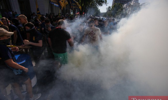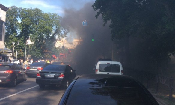 Возле ул. Грушевского также стоит группа митингующих, представителей "Национального корпуса "Азов". Кто-то бросил дымовую шашку на ул. Грушевского.