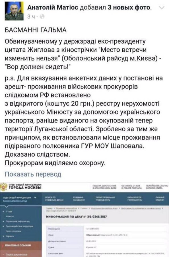 По словам Матиоса, для указания личных данных в постановлении на арест адреса военных прокуроров были взяты из реестра недвижимости украинского Минюста с помощью паспорта, ранее выданного на ныне неподконтрольной территории Луганской области.