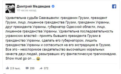 «Удивительна судьба Саакашвили: гражданин Грузии, президент Грузии, лицо, лишенное гражданства Грузии, гражданин Украины, друг президента Украины, губернатор Одесской области, лицо, лишенное гражданства Украины. Удивительна последовательность украинских властей — принять бывшего президента Грузии в гражданство Украины, сделать его губернатором, лишить гражданства Украины и согласиться на его экстрадицию в Грузию», — написал он.