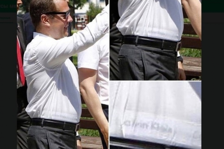 На фото Медведева видна широкая полоска трусов с надписью Calvin Klein, просвечивающая из-под тонкой белой рубашки премьера.