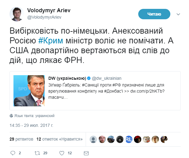 "Выборочность по-немецки. Анексию Россией # Крыма министр предпочитает не замечать. А США двухпартийно возвращаются от слов к действиям, пугает ФРГ", - написал Арьев.