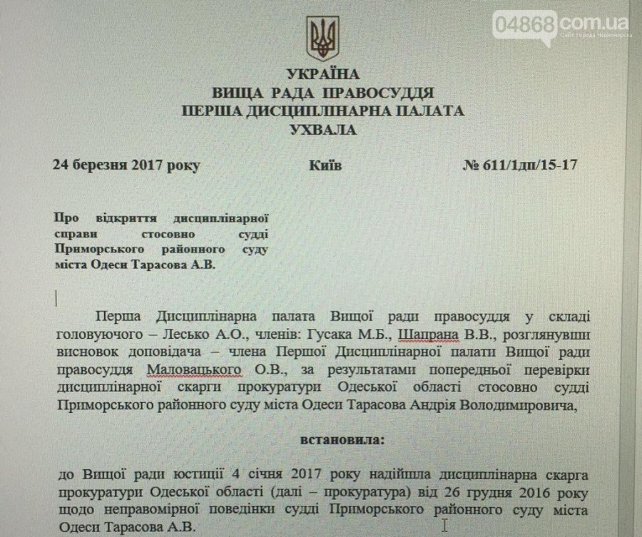 По официальной информации судья Приморского суда г. Одессы Андрей Тарасов, который своим решением создал дестабилизирующую ситуацию в Черноморском порту, является главным фигурантом дисциплинарного дела в Первой дисциплинарной палате Высшего Совета Правосудия. Дело на Тарасова Андрея Владимировича открыто еще в марте этого года на основании дисциплинарной жалобы и уже прошло предварительную проверку прокуратуры Одесской области.
