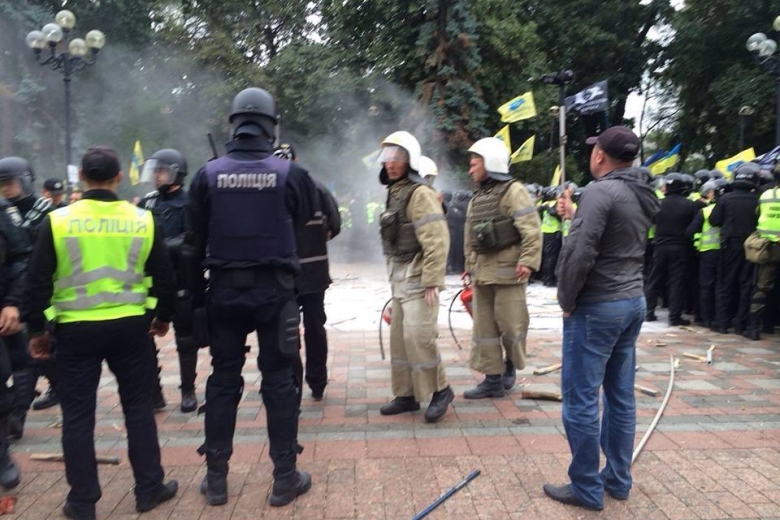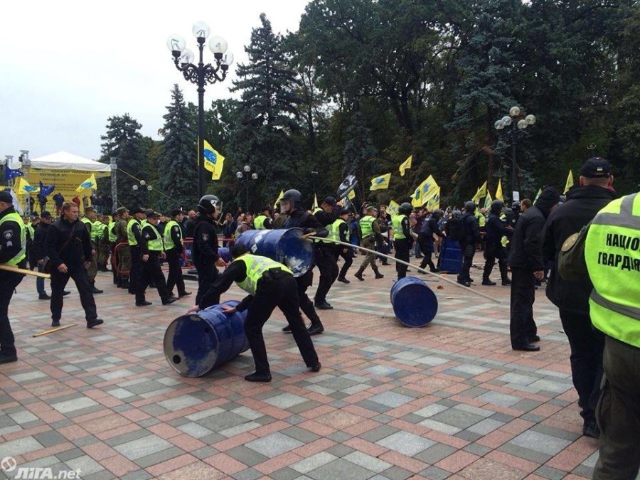 Затем полицейские вышли за ограждение, оттеснили протестующих, разобрали конструкцию из шин и бочек и вернулись на исходную позицию под стенами парламента.