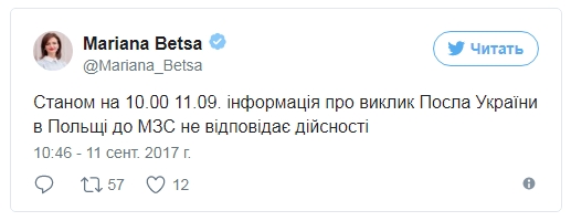 "По состоянию на 11 сентября информация о вызове посла Украины в Польше в МИД не соответствует действительности", - сообщила она.