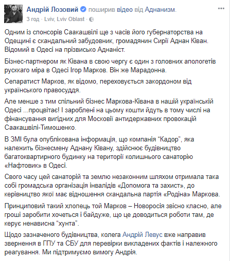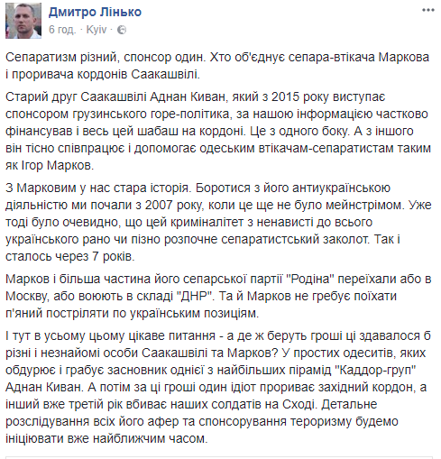 "Сепаратизм разный, спонсор один. Кто объединяет сепара-беглеца Маркова и Саакашвили, который прорывает границу. Старый друг Саакашвили Аднан Киван, который с 2015 года выступает спонсором грузинского горе-политика, по нашей информации, частично финансировал и весь этот шабаш на границе. Это с одной стороны. А с другой он тесно сотрудничает и помогает одесским беглецам-сепаратистам таким, как Игорь Марков", - написал нардеп.