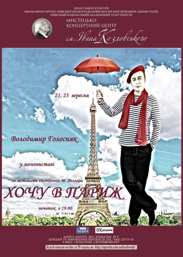 21 и 23 сентября в Художественно-концертном центре им. Ивана Козловского (г. Киев, ул. Крещатик, 50-Б) состоится моноспектакль «Хочу в Париж».