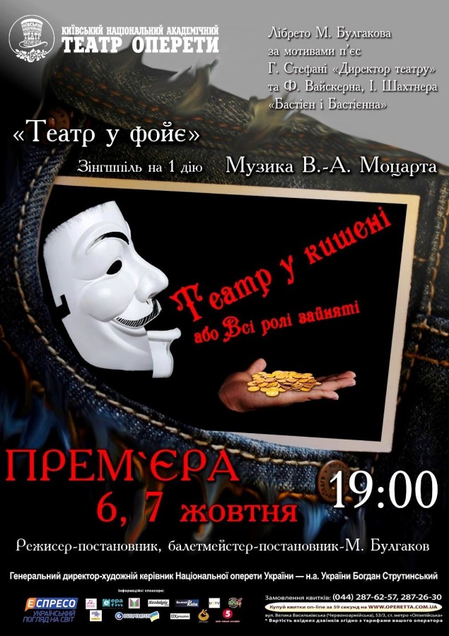 Первой премьерой, которой Национальная оперетта порадует своего Зрителя, станет комическая опера-зингшпиль на музыку В.-А. Моцарта «Театр в кармане, или Все роли заняты» - постановка молодого перспективного режиссера, ведущего солиста балета Национальной оперетты, актера, балетмейстера Максима Булгакова. Сюжет вобрал в себя две комические оперы великого композитора - "Директор театра" и "Бастьен и Бастьенна". Тема извечных интриг закулисья невероятно многогранна и интересна! А влияние власти и денег на чувства и поступки людей - как ни печально - актуально во все времена. Благо, что существует чистая, бескорыстная, жертвенная Любовь, которой не страшны любые козни и испытания…