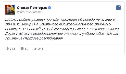 "Принял решение об отстранении от должности начальника клиники психиатрии Национального военно-медицинского клинического центра "Главный военный клинический госпиталь" полковника Олега Друзя в связи с неудовлетворительным выполнением служебных обязанностей и назначил служебное расследование", - написал Полторак.
