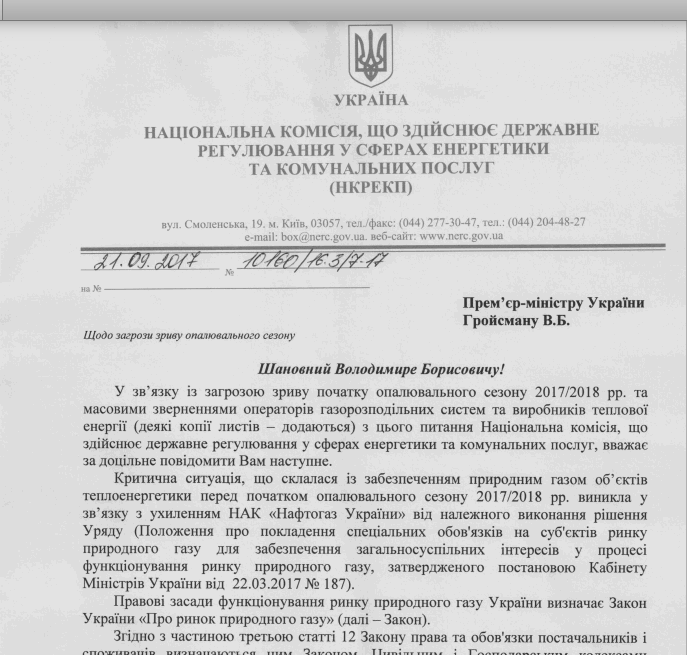 Из-за манипуляций в НАК «Нафтогаз Украины» в Украине может быть сорван отопительный сезон 2017-2018 гг. Об этом глава НКРЭКУД. Вовк указал в обращении к главе правительства Владимиру Гройсману.