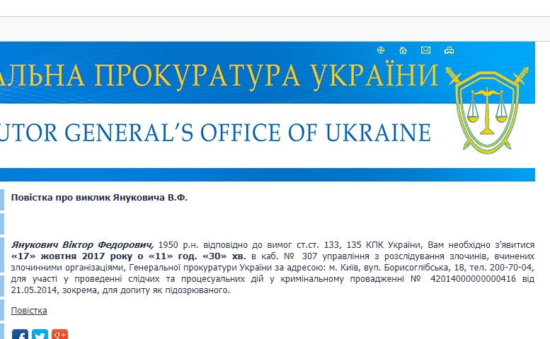 "Янукович Виктор Федорович, 1950 г.р. в соответствии с требованиями ст. 133, 135 УПК Украины, Вам необходимо явиться 17 октября 2017 года в 11 ч. 30 мин. в каб. № 307 управления по расследованию преступлений, совершенных преступными организациями, Генеральной прокуратуры Украины по адресу: г. Киев, ул. Борисоглебская, 18, тел. 200-70-04, для участия в проведении следственных и процессуальных действий в уголовном производстве № 42014000000000416 от 21.05.2014, в частности, для допроса в качестве подозреваемого", – говорится в тексте повестки.