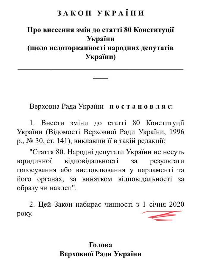 В соответствии со ст.80 Конституции, депутатам Рады гарантируется депутатская неприкосновенность: они не несут юридической ответственности за результаты голосования или высказывания в парламенте и его органах (кроме ответственности за оскорбление или клевету), а также не могут быть без согласия парламента привлечены к уголовной ответственности, задержаны или арестованы.