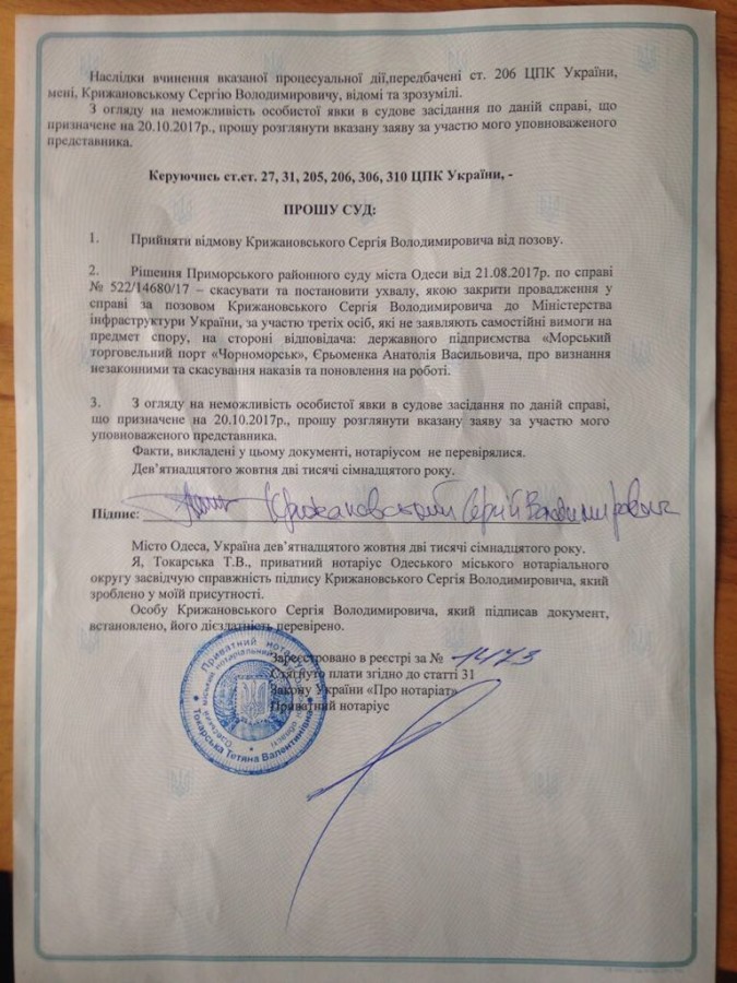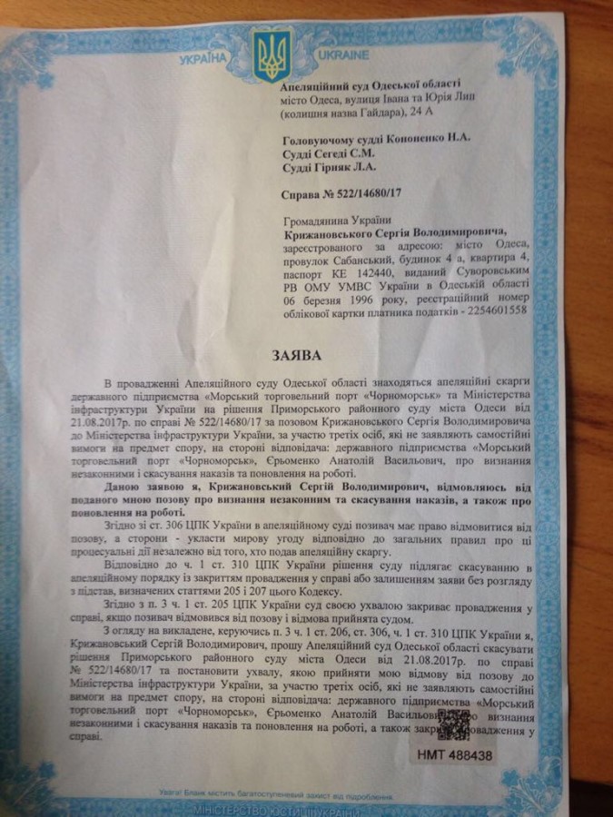 Судебная тяжба дошла до Апелляционного суда Одесской области, однако дело получило неожиданный поворот. Сергей Крыжановский вдруг решил, что его увольнение было законным, и отозвал свой иск к Министерству инфраструктуры Украины. Более того, он попросил, чтобы решение Приморского районного суда города Одессы о его восстановлении в должности, было отменено.