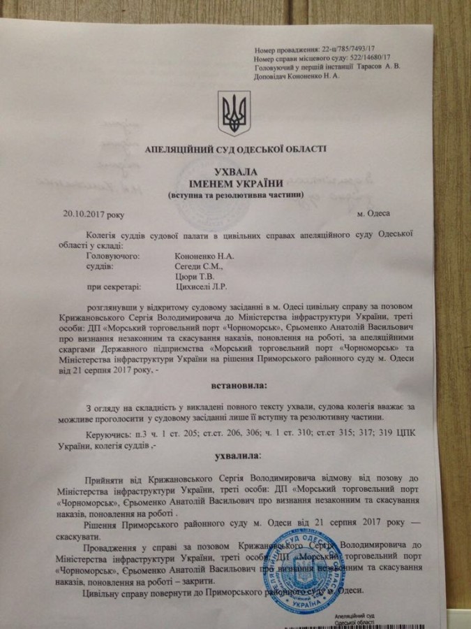 Сегодня Апелляционный суд Одесской области удовлетворил просьбу Сергея Крыжановского – решение Приморского районного суда от 21 августа отменено, а производство по делу с иском к МИУ об отмене приказа №83-О и восстановлении его на работе закрыто.