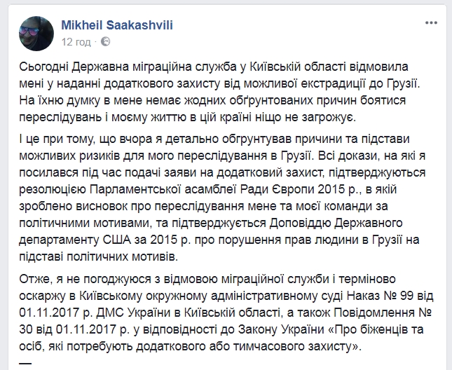 "Сегодня Государственная миграционная служба в Киевской области отказала мне в предоставлении дополнительной защиты от возможной экстрадиции в Грузию. По их мнению, у меня нет никаких обоснованных причин бояться преследований и моей жизни в этой стране ничто не угрожает. И это при том, что вчера я подробно обосновал причины и основания возможных рисков для моего преследования в Грузии", – написал Саакашвили.