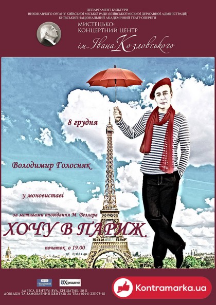 8 декабря в Художественно-концертном центре им. Ивана Козловского состоится моноспектакль Владимира Голосняка «Хочу в Париж». Спектакль создан по мотивам одноименного рассказа Михаила Веллера