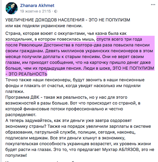 Правда, забыто, что в этом миграционная служба Украины ей мотивированно отказала. Но Жанара Ахметова, меняющая псевдонимы (Жанна Бота, Жанара Ахмет), не отчаивается – она продолжает писать тексты - на зависть все порохоботам, восхваляя, украинскую пенсионную реформу. Несколько странная риторика как для оппозиционера, не так ли? Но всё логично если учесть, что в эту пятницу будет заседание Аппеляционного суда Киева, в котором беглянка попытается оспорить отказ Украины предоставить ей статус политического беженца. Неуклюжий реверанс в адрес наших властей?
